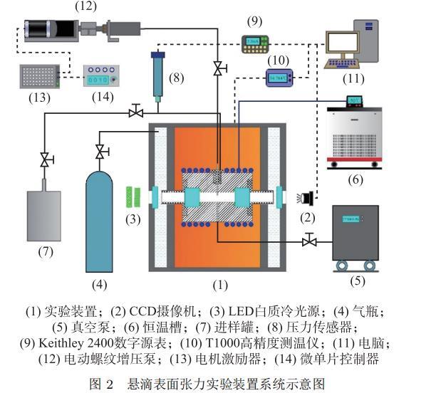 本文所搭建的懸滴法表面張力實驗系統(tǒng)的溫度和壓力適用范圍為 223.15 ~ 373.15 K 和 0 ~ 15 MPa。實驗系統(tǒng)示意圖如圖 2 所示,其主要包括實驗裝置本體、恒溫槽、溫度控制與測量系統(tǒng)、氣體增壓與壓力測量系統(tǒng)、液滴控制系統(tǒng)、真空系統(tǒng)、圖像采集和數(shù)據(jù)處理系統(tǒng)。