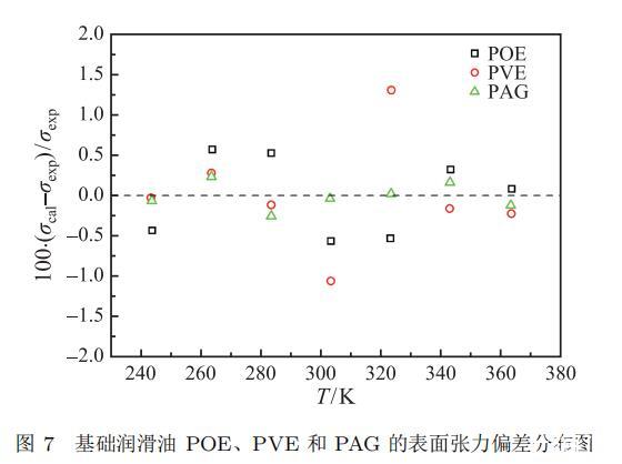 式中,T 是溫度,K;σ 是表面張力,mN·m?1;a、b 和 c 為關(guān)聯(lián)方程的擬合參數(shù)。基礎(chǔ)潤滑油 POE、PVE 和 PAG 的參數(shù)關(guān)聯(lián)值和絕對平均偏差列于表 4 中,其實(shí)驗(yàn)數(shù)據(jù)與關(guān)聯(lián)方程的絕對平均偏差分別為 0.43%、0.45% 和 0.13%;三種基礎(chǔ)潤滑油的相對偏差分布如圖 7 所示,其實(shí)驗(yàn)測量結(jié)果的相對偏差均在 ±1.5% 以內(nèi),表明實(shí)驗(yàn)結(jié)果與關(guān)聯(lián)方程的吻合良好。