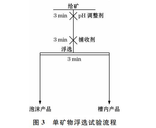 采用一次粗選的試驗流程,探究十二胺(DDA)和YTDB在不同礦漿pH、不同捕收劑用量下,對石英以及赤鐵礦回收率的影響。單礦物浮選試驗在XFD-Ⅲ浮選機進行,在室溫條件下配制礦漿,稱取2.00 g的單礦物放入浮選槽中,再加入20 g去離子水,控制浮選機的攪拌速度為1900 r/min,攪拌2 min以充分攪勻礦漿。加入事先準(zhǔn)備好的pH調(diào)整劑調(diào)漿3 min,再加入捕收劑調(diào)漿3 min后,開始刮泡,控制刮泡時間為3 min.浮選結(jié)束后,將精礦進行過濾、烘干、稱重,隨后計算其回收率。單礦物浮選試驗流程如圖3所示。