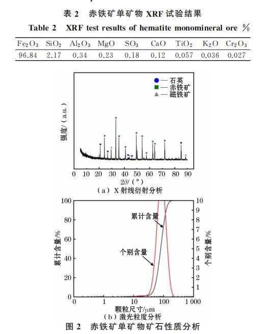 赤鐵礦單礦物則取自某鐵礦廠,將制備后的赤鐵礦樣品進行X射線衍射(XRD)分析、X射線熒光光譜(XRF)分析和激光粒度分析,XRD的分析結(jié)果如圖2(a)所示,XRF的分析結(jié)果見表2,粒度分析如圖2(b)所示。從圖2(a)和表2可以看出,F(xiàn)e?O?峰強度最高,含量達到了96.84%,另外含有少量的氧化物SiO?、Al?O?等。從圖2(b)可以看出,樣品的中值粒徑D??達到了79.89μm,D??則達到了123.2μm.綜合上述純度以及粒度,赤鐵礦可滿足后續(xù)單礦物試驗的要求。