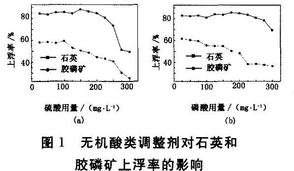 硫酸和磷酸是較為有效的膠磷礦抑制劑,工業應用廣泛??疾靷鹘y調整劑對石英和膠磷礦可浮性的影響,結果見圖1。