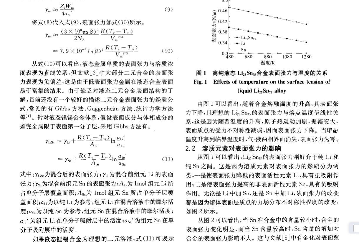 由圖l可以看出,隨著合金熔融溫度的升高,其表面張力下降,且理想的Li Sn;的表面張力與熔點溫度呈線性關系,這是因為隨著溫度的升高,原子熱運動加劇,振幅變大,表面質點的受力不對稱性減弱,因而表面張力下降。當熔融溫度升高到臨界溫度時,氣一液兩相界面消失,表面張力為零。