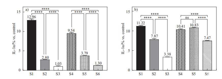 IL-1a值是從用稀釋的表面活性劑復合物S1-S6(濃度為0.015%和0.020%)處理24小時后收集的上清液進行分析的。選擇的處理濃度是細胞仍然存活,同時可以觀察到IL-1a釋放差異的濃度(數據未顯示)。IL-1a值與未經任何處理的對照樣品校準后進行比較。如圖4所示,在表面活性劑復合物中加入海藻糖脂(S3和S6)可顯著減少二元體系S1和S4的細胞因子釋放。但在SMCT/CAPB體系中加入DG(S4 vs S5)在0.02%時并未抑制IL-1a釋放。此外,海藻糖脂比DG更能降低IL-1a釋放,且差異顯著(S3 vs S2,S6 vs S5)。在濃度效應方面,它對三元體系(S2-S3,S5-S6)影響更大,意味著非離子表面活性劑可以在較低濃度下進一步抵消離子表面活性劑對IL-1a的刺激。