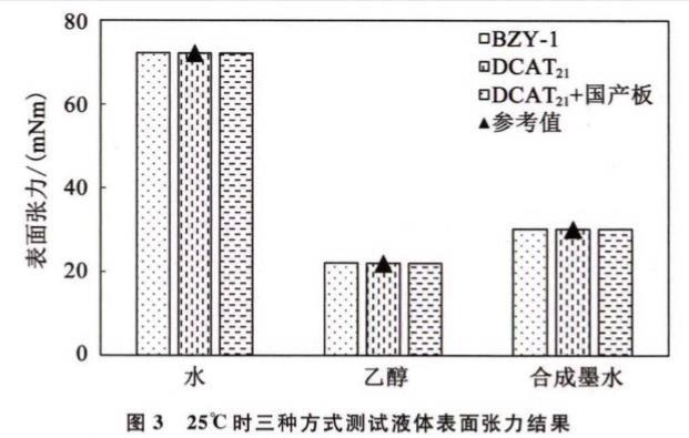 使用BZY-1表面張力儀(原配國產鉑金板)、表面張力儀(原配進口鉑金板)和表面張力儀(選配國產鉑金板)對水、無水乙醇、合成墨水進行表面張力測試,測試結果如圖3所示。