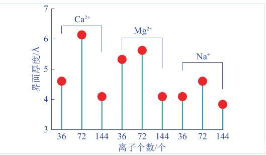 溶劑密度從10%升到90%的范圍為界面層,通過(guò)相對(duì)數(shù)密度分布曲線可估算出界面厚度。不同濃度含鹽泡沫體系界面厚度變化的火柴圖,如圖4所示。由圖4可知,不同濃度含鹽泡沫體系界面厚度隨濃度的變化規(guī)律一致。即當(dāng)離子種類(lèi)一定時(shí),高濃度含鹽泡沫體系的界面厚度最小,低濃度次之,中濃度最大。對(duì)于低濃度含鹽泡沫體系而言,Mg2+的界面厚度最大,Ca2+次之,Na+最小;中濃度含鹽泡沫體系中,Ca2+的界面厚度最大,Mg2+次之,Na+最小;高濃度含鹽泡沫體系中,Mg2+的界面厚度最大,Ca2+次之,Na+最小。綜上可知,硬水離子的存在使得泡沫界面厚度有所增加,這意味著界面中水分子內(nèi)部的相互作用減弱,使得界面水分子受到的指向泡沫內(nèi)部的不平衡拉力減弱。