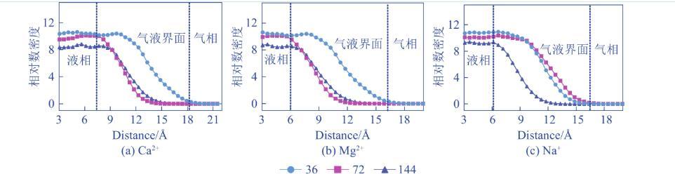 由圖3,水分子相對(duì)數(shù)密度從液相到氣相逐漸減少到0,在液相區(qū)域內(nèi),離子濃度越高水分子的相對(duì)數(shù)密度越低。其中Ca2+與Mg2+泡沫體系的變化規(guī)律大體一致,而Na+泡沫體系則有所差異。對(duì)于Ca2+、Mg2+泡沫體系而言,低濃度時(shí)水分子的相對(duì)數(shù)密度在除氣相區(qū)域外的任何區(qū)域內(nèi)均大于中、高濃度時(shí)的相對(duì)數(shù)密度,中、高濃度曲線在氣液界面區(qū)域內(nèi)交于1點(diǎn)后,中濃度時(shí)水分子的相對(duì)數(shù)密度開(kāi)始小于高濃度時(shí)水分子的相對(duì)數(shù)密度。但中、高濃度曲線的交匯處明顯不同,Ca2+泡沫體系在9.2?附近產(chǎn)生交匯,Mg2+泡沫體系在7.2?附近產(chǎn)生交匯,兩者交匯時(shí)水分子的相對(duì)數(shù)密度均為8.1。Na+泡沫體系中,高濃度時(shí)水分子的相對(duì)數(shù)密度在除氣相區(qū)域外的任何區(qū)域內(nèi)均小于中、低濃度時(shí)的相對(duì)數(shù)密度,中、高濃度曲線在氣液界面區(qū)域內(nèi)交于1點(diǎn)后,中濃度時(shí)水分子的相對(duì)數(shù)密度開(kāi)始大于高濃度中水分子的相對(duì)數(shù)密度。
