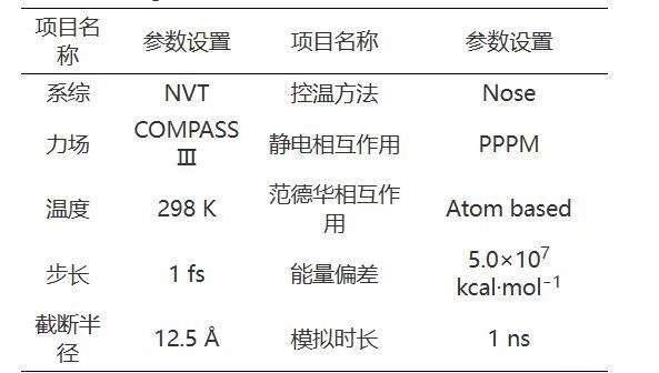 分子動(dòng)力學(xué)模擬過(guò)程由Forcite模塊完成。初始泡沫體系的結(jié)構(gòu)并不穩(wěn)定,需對(duì)泡沫初始模型進(jìn)行結(jié)構(gòu)優(yōu)化以獲得穩(wěn)定的低能量泡沫結(jié)構(gòu)。在分子動(dòng)力學(xué)模擬開(kāi)始前,利用Forcite模塊中的Anneal對(duì)幾何優(yōu)化后的泡沫模型進(jìn)行退火操作。利用Dynamic進(jìn)行分子動(dòng)力學(xué)模擬,系綜、力場(chǎng)、溫度等相關(guān)參數(shù)設(shè)置情況見(jiàn)表1。