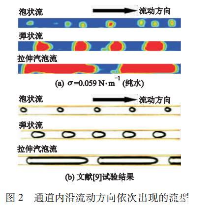 通道內(nèi)沿流動(dòng)方向依次出現(xiàn)的流型如圖2所示,圖2a為σ=0.059 N·m?1(純水)條件下,數(shù)值計(jì)算得到的微通道內(nèi)汽液兩相呈現(xiàn)的流型。不難看出:沿流動(dòng)方向依次出現(xiàn)泡狀流(汽泡呈球形)、彈狀流(汽泡呈前端橢球,中間圓柱體,尾端近扁平狀)和拉伸汽泡流(汽泡在微通道內(nèi)受限,呈拉伸的柱形)3種流型。這與通過沸騰試驗(yàn)得到的490μm矩形通道內(nèi)觀測(cè)段的流型及汽泡形態(tài)(圖2b)一致。此外,數(shù)值模擬結(jié)果還與其他文獻(xiàn)中的試驗(yàn)結(jié)果進(jìn)行比對(duì),結(jié)果表明:計(jì)算模型與數(shù)值方法可行,計(jì)算結(jié)果與試驗(yàn)數(shù)據(jù)吻合較好。