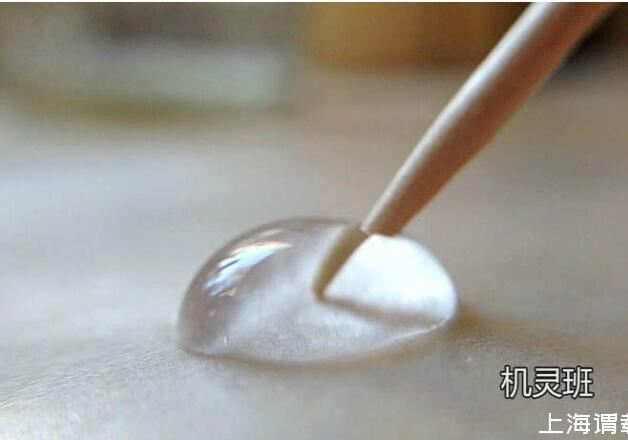 引申實驗,在水滴上放置1滴油,把它們混合在一起后,再用干凈的牙簽戳混合后的液滴,看看此時會發(fā)生什么現(xiàn)象。然后用蘸有洗潔精的牙簽戳混合后的液滴,看看又會出現(xiàn)什么現(xiàn)象。