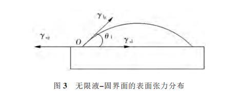 朱定一等通過設(shè)計一種在有限液-固界面上的潤濕性表征體系,推導(dǎo)出在無限液-固界面系統(tǒng)中固相表面張力和液-固界面張力的計算方法,并且通過潤濕角實(shí)驗(yàn)和計算,證實(shí)了在接觸角較大時,該理論對固相表面張力的一致性。圖3所示為液相在無限固體平面上的潤濕表征系統(tǒng)。其中γsl、γlg、γsg分別表示固-液、液-氣、固-氣3個界面上的表面張力,O為氣-液-固三相接觸點(diǎn),θ1為氣-液界面的切線與固-液界面的夾角,即接觸角。當(dāng)達(dá)到平衡時,作用于潤濕周邊的3個表面張力在水平方向的分力必為0,此時的平衡狀態(tài)方程,即Young方程為
