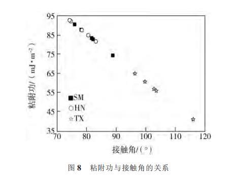 將接觸角θ與γlg代入式(9)可得煤顆粒與水的粘附功,結(jié)果見圖7。由圖可知,隨著超細(xì)粉碎時間的延長,煤-水體系的粘附功的變化趨勢與接觸角的變化趨勢相反。3種煤樣的接觸角與粘附功的關(guān)系見圖8。由圖可知,隨著接觸角的增大,煤-水界面的粘附功減小,說明粘附功越小,煤顆粒的潤濕性越差。粘附功也可作為衡量煤顆粒潤濕性的指標(biāo)。
