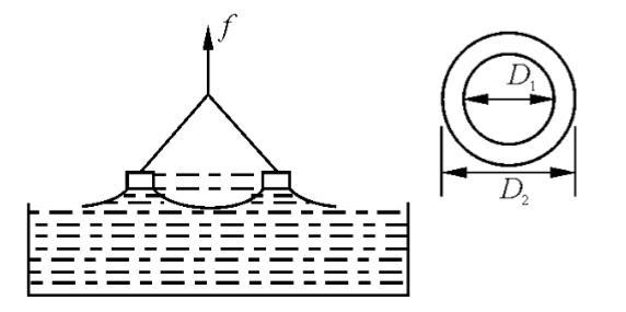 將一內、外直徑分別為D1、D2的金屬環懸掛在定滑輪上。先將它浸入液體中,然后轉動升降臺,緩慢地將液體下移,此時金屬環會拉起一個與液體相連的水柱。此水柱的形成是因為金屬吊環受到了液體表面張力的作用。由于金屬環會受到液體表面向下的拉力,定滑輪給金屬環向上的拉力逐漸變大,達到一定值(即為液體表面張力值)時,水柱會破裂。金屬吊環受到的表面張力表現為吊環內外圓受到液面以一定的拉力F作用,此拉力方向垂直于線段,大小與吊環的內外直徑呈正比。即