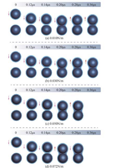 針對表面液膜厚度為0.15Rp、碰撞初速度為10m/s、表面張力系數(shù)為0.01~0.072N/m的濕顆粒碰撞過程進(jìn)行了詳細(xì)的數(shù)值模擬。如圖5所示,不同表面張力系數(shù)影響了液橋形態(tài)的演化規(guī)律。在0.14μs時(shí),具有不同表面張力的濕顆粒同時(shí)接觸液膜,隨后在液體分子相互作用力的推動(dòng)下,液膜流動(dòng)迅速并填充進(jìn)顆粒間的間隙,形成穩(wěn)定的液橋。碰撞后,顆粒1反彈向上,拉伸液橋使其變高變細(xì),最終顆粒上升到最高點(diǎn)時(shí),動(dòng)能被完全消耗,被液橋重新拉回液膜表面,實(shí)現(xiàn)兩顆粒的聚并。當(dāng)表面張力系數(shù)為0.01N/m時(shí),顆粒向上反彈的高度更加明顯,回落后與下方顆粒再次碰觸反彈,最終在0.46μs時(shí)聚并。隨著表面張力的增加,顆粒反彈時(shí)的速度衰減更快,液橋更快地將其拉回液膜表面。