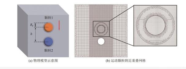 圖2 物理模型示意圖與運(yùn)動(dòng)顆粒附近重疊網(wǎng)格