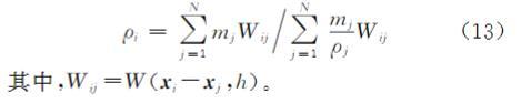 針對CSF流體表面張力模型中流體表面的粒子數(shù)目較少,流體表面的流體粒子密度求和的邊界截斷誤差較大,進而導致流體表面張力模擬不穩(wěn)定的問題,本文對邊界粒子的密度進行修正,計算公式為:ρi=∑ N j=1 mjWij∑ N j=1 mj ρj Wij(13)其中,Wij= W( xi- xj, h)。