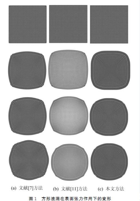 分別用文獻方法、文獻方法及本文方法模擬在表面張力作用下水珠的形成過程,對比它們的模擬效果,如圖1所示。圖1方形液滴在表面張力作用下的變形341第1期汪歡歡,等:改進的CSF流體表面張力模型實驗在Window7平臺上進行,采用Visual Studio2013。實驗環(huán)境為Intel(R)Core(TM) i5G2400,3.10GHzCPU,4G內(nèi)存,NVIDIA GeG forceGT620顯卡,實驗所采用的流體粒子數(shù)目為1024。模擬總幀數(shù)為500,文獻方法、文獻方法及本文方法分別用時9.12、9.87、9.34s。從實驗結(jié)果可以看出,本文方法與文獻方法、文獻方法的模擬時間差異很小,但本文方法模擬的水珠達到穩(wěn)定狀態(tài)時表面更加圓滑,這說明本文方法可以更準確、有效地模擬流體表面張力。