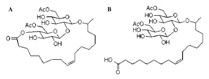 通常,槐糖的60-和600-羥基被乙?;舅徭滈L度在16到18個碳之間變化(一個例外是由R.bogoriensis合成的SLs,其中包括22和24個碳的脂肪酸側(cè)鏈;Nun?ez et al.2004); 并且可能是飽和的或不飽和的。 此外,SLs的優(yōu)選結(jié)構(gòu)構(gòu)象為內(nèi)酯,其中脂肪酸的羧基在碳400處酯化為二糖環(huán),盡管在某些情況下,SLs的脂肪酸可能保持游離酸、開鏈形式。