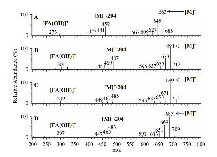 在B和C中,在15和20分鐘之間沒有任何明顯的峰表明,在A和D中在15和20分鐘之間洗脫的峰對應于含有棕櫚酸和亞油酸的SLs,在21分鐘和25分鐘洗脫的峰分別對應于含有油酸和硬脂酸的SLs。 大氣壓化學電離質譜(APCI-MS)證實了這一點。 圖3顯示了TIC中每個基峰的APCI-MS。