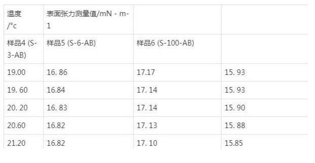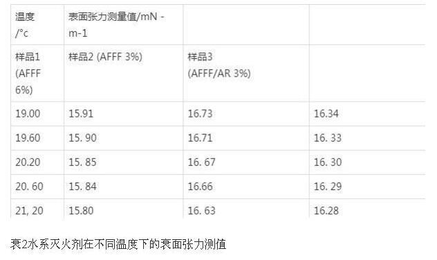 溫度條件對于液體表面張力存在著很大的影響。大量試驗數(shù)據(jù)表明,液體的表面張力會隨著溫度的升高而降低。通過對一系列流體滅火劑產(chǎn)品,包括不同配比的泡沫滅火劑(成膜型)、水系滅火劑等樣品進(jìn)行測試,可以清晰地從表1、表2中看出,溫度的變化對流體型滅火剤的表面張力存在一定程度的影響。