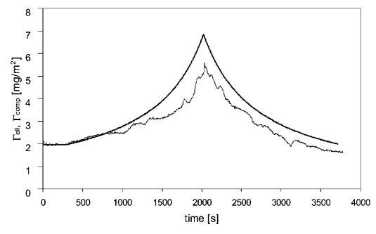 圖8代表性壓縮-吸附b-乳球蛋白(c=0.01 wt%)的膨脹實(shí)驗(yàn),壓縮低于每個(gè)分子的面積。 通過(guò)擴(kuò)散量和壓縮量(Gcomp)和橢偏儀(Gell)測(cè)量的預(yù)期吸附量。