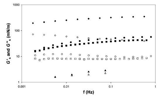 表面剪切流變學(xué)。 所有四個(gè)系統(tǒng)的表面剪切流變測(cè)量如圖11所示。 我們觀察到HFBII具有模量,比b-乳球蛋白和皂甙高一個(gè)數(shù)量級(jí),這與早期結(jié)果一致。25值得一提的是,對(duì)于像奎拉葉皂甙這樣的表面活性劑,測(cè)得的表面剪切彈性非常高。 b-酪蛋白的表面剪切模量要低一個(gè)數(shù)量級(jí)。 關(guān)于頻率,我們發(fā)現(xiàn)與HFBII相比,皂甙和b-乳球蛋白對(duì)頻率的依賴(lài)性更強(qiáng),尤其是在低頻率下。 此外,對(duì)于HFBII而言,Gs 00/Gs0的比率是最低的,即表面彈性對(duì)模量的貢獻(xiàn)比表面粘度大得多。 當(dāng)我們向交叉點(diǎn)外推時(shí),我們預(yù)計(jì)HFBII和b-乳球蛋白或皂甙之間的弛豫時(shí)間會(huì)有一個(gè)數(shù)量級(jí)的差異。 對(duì)于b-酪蛋白,從0.01 Hz左右的數(shù)據(jù)可以很容易地觀察到交叉點(diǎn)。