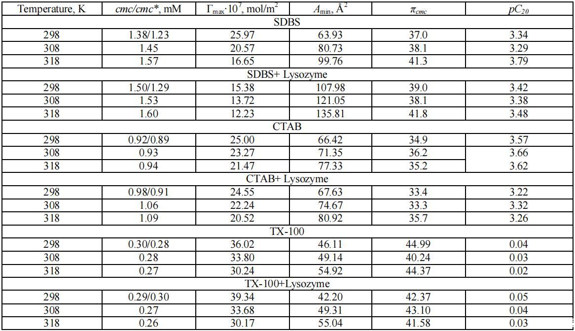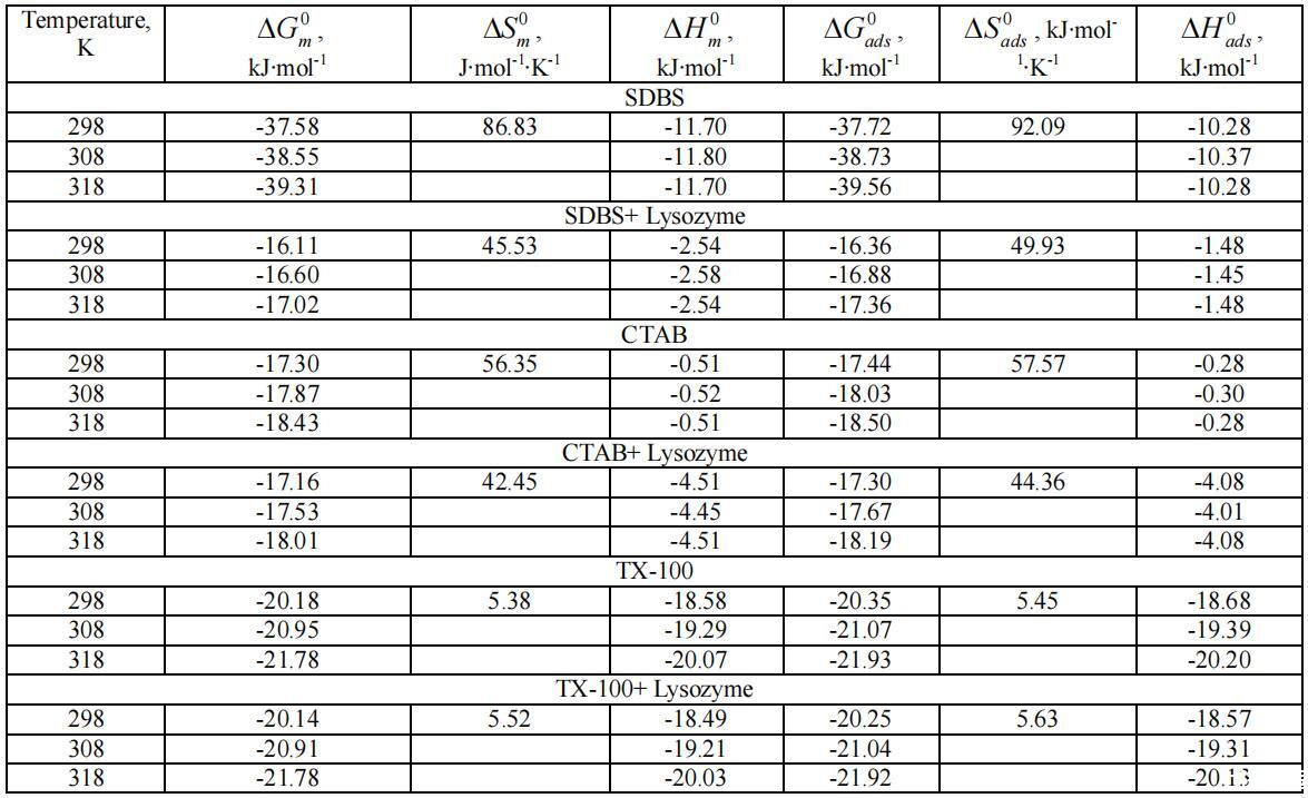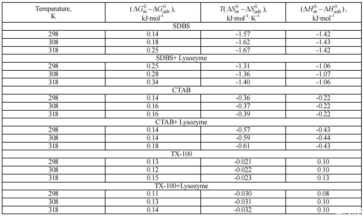 在溶菌酶存在和不存在的情況下,不同種類表面活性劑的物理化學和熱力學性質如下所述: