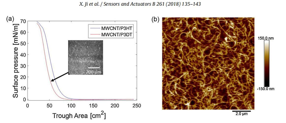 3.1.1.1.空氣-水界面和PDMS基底上的單層結構。空氣-水界面上分布的兩種MWCNT/P3DT和MWCNT/P3HT復合膜的壓縮等溫線如圖3a所示。兩個系統的等溫線形狀相似,其特征是表面壓力急劇上升,直到在60 mN/m左右檢測到坍塌。這表明在空氣-水界面形成了冷凝和穩定的單層。應該注意的是,在沒有鉑的情況下,多壁碳納米管不會在空氣-水界面形成朗繆爾單層。以15 mN/m壓縮的MWCNT/P3DT單層的布儒斯特角顯微鏡(BAM)圖像如圖3a中的插圖所示。通過與純PT單層(補充數據,第2節,圖S2)比較,嵌入PT凝聚相中的MWCNT可以觀察到尺寸為幾微米的小亮點。還可以觀察到與MWCNT聚集體相對應的一些稍大的亮點。對于MWCNT/P3HT單層,觀察到類似的行為。因此,BAM圖像證實PTs是MWCNT的良好分散劑[34]。為了進一步了解該單層的結構,在15 mN/m的表面壓力下,拍攝轉移到100μm厚PDMS基底上的單層的AFM圖像(圖3b)。由于未檢測到PT側鏈長度的顯著影響,因此僅顯示了MWCNT/P3DT系統的AFM圖像。AFM形貌顯示出均勻且致密的MWCNT地毯。多壁碳納米管明顯相互連接,形成一個網絡,反映了復合單層從水面到PDMS基底的成功LS轉移。