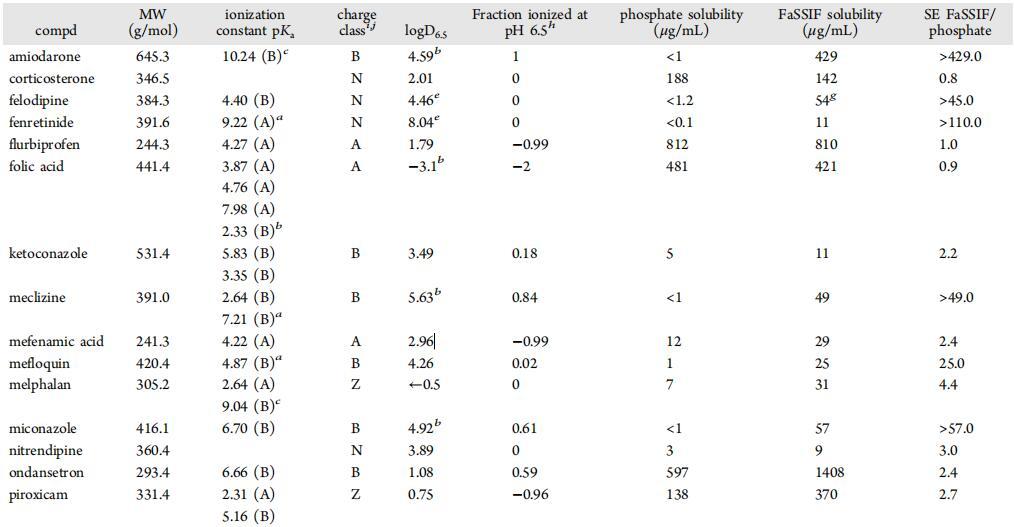 在FaSSIF和水性緩沖液中的溶解度評估和物理化學特性。選擇了一組21種上市藥物和30種來自不同研究項目的羅氏化合物,因為它們在pH值為6.5的水性緩沖液和FaSSIF介質(zhì)中的溶解度不同。作為標準做法,所有溶解度和表面壓力剖面測量均在室溫下進行,而不是在37°C下進行。盡管溫度可能會影響藥物溶解度、脂質(zhì)聚集體分配和溶解,據(jù)報道,牛磺膽酸膠束的聚集數(shù)對溫度變化相對不敏感。19該化合物組包含不同的化學性質(zhì)、廣泛的親脂性,并涵蓋不同類型和程度的電荷狀態(tài),包括中性、酸性、堿性和兩性離子分子。表1列出了主要理化性質(zhì)和溶解度數(shù)據(jù)。