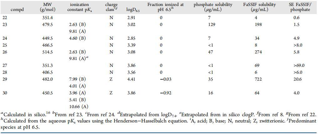 以前曾使用一組參考化合物觀察到,電離酸性化合物的硒通常低于電離堿。結(jié)果表明,由于與帶負電荷的FaSSIF介質(zhì)組分之間的靜電排斥作用,離子酸在FaSSIF中的溶解度沒有增加。8在目前的研究中,對于幾個涵蓋更廣泛化學空間的專利化合物,我們沒有發(fā)現(xiàn)離子化酸或堿之間硒的任何顯著溶解度差異,這表明靜電相互作用可能被其他因素掩蓋或覆蓋,如化合物的構(gòu)象和親油性。