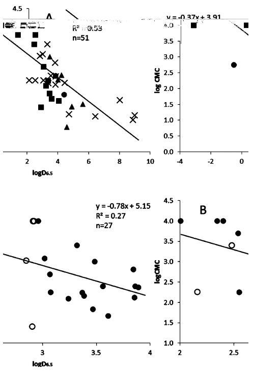 圖6。對于分類為酸的完整化合物組(A),根據(jù)pH 6.5(logD6.5)下的辛醇分配系數(shù)繪制對數(shù)CMC(μM)(■),基地(▲),中性離子(x)和兩性離子(?),以及l(fā)ogd2和logd4(B)范圍內(nèi)的化合物。圖B中的開放圓對應于從文獻檢索、預測或從pH值為7.4的logD推斷的logD值。高于或低于檢測限的值在檢測限處繪制。
