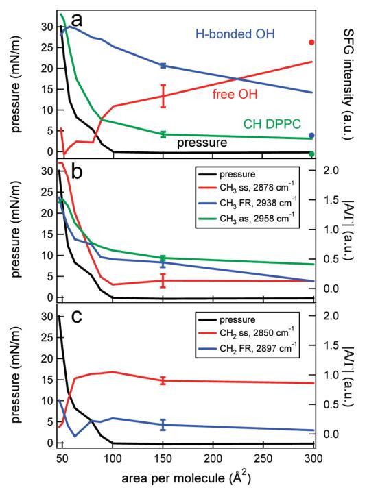 SFG光譜中不同振動的積分SFG強度與圖6a中的表面壓力一起繪制,作為每個分子面積的函數(shù)。CH強度隨著表面DPPC分子數(shù)量的增加而非線性增加。水信號持續(xù)增加,而自由OH信號隨著表面分子數(shù)量的增加而持續(xù)減少,正如預期的那樣,當系統(tǒng)達到液體膨脹相時,27達到零值。原則上,在氣相和液相膨脹相的共存區(qū)(如上~每個分子100?2),人們可能會看到波動的SFG信號,因為氣相不發(fā)出信號,而液相膨脹相發(fā)出信號。用二次諧波發(fā)生器28和橢偏儀觀察到了這種波動信號。29然而,此處未觀察到這些波動,因為呈現(xiàn)的SFG光譜平均超過10分鐘,這在磁疇擴散的時間尺度上很長,發(fā)生在數(shù)十秒的時間尺度上。28,29