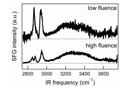 圖7。高密度水上DPPC的SFG光譜(SSP極化)(~每分子45?2)在低濃度下(~1.5 mJ/cm2)和高通量(~10 mJ/cm2),單脈沖加熱量分別在0.3至3°C(取決于紅外頻率)和2至19°C之間。為了清晰起見,對光譜進行了偏移,并根據(jù)相對紅外強度進行了縮放。注意,由于在高通量下發(fā)生的熱效應,形狀非常不同。這兩種光譜都是用非旋轉槽測量的。