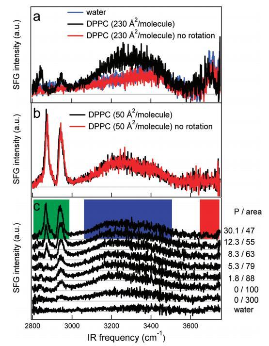 圖5。(a)DPPC在水上以230?2/分子(黑色)和不旋轉(紅色)槽的SSP極化的SFG光譜。樣品以這樣的方式旋轉:在激光焦點處,樣品以~0.06 m/s。不旋轉時,光譜與水相同?空中接口(藍色)。(b)在高密度(每個分子50?2)下,旋轉(黑色)和非旋轉(紅色)之間沒有區(qū)別。(c)裸露水面的SFG光譜(SSP極化)(底部光譜)和密度增加的水中DPPC的SFG光譜。壓力(mN/m)和每個分子的面積(?2)分別從底部到頂部增加和減少,在圖表旁邊給出。每個分子的面積由氯仿溶液滴的數(shù)量控制。彩色方塊標記了圖6中使用的積分區(qū)域。本實驗中使用了相對較低的紅外注量(1.5 mJ/cm2)。