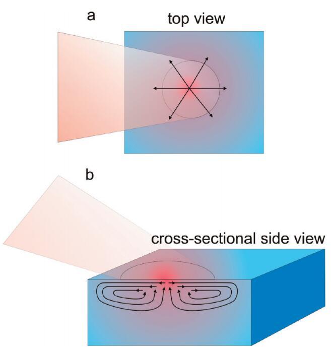 圖4。水樣近表面區(qū)域穩(wěn)態(tài)加熱引起的流動示意圖。溫度示意圖上用顏色表示,其中紅色表示熱,藍色表示冷。橙色陰影區(qū)域顯示入射到表面的激光束,箭頭表示溫度梯度誘導流動的方向。(a)俯視圖,顯示近表面區(qū)域的徑向位移,(b)橫截面?zhèn)纫晥D,顯示產(chǎn)生的Marangoni流動單元。請注意,在焦點的中心,水流向上,因此表面可以有效地持續(xù)更新。