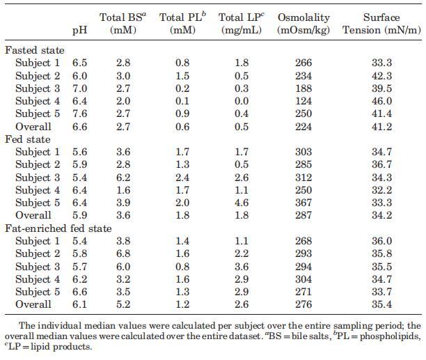 攝入Sure Plus1或Scandishake Mix1后前2小時(shí)的滲透壓通常高于禁食狀態(tài)下的HIF,盡管禁食狀態(tài)和兩種喂食狀態(tài)之間未達(dá)到顯著差異。禁食狀態(tài)滲透壓值一般為低滲透,或接近等滲透值。224 mOsm/kg的總體中值為低滲透性,與Brouwers等人1和Deferme等人報(bào)告的人類(lèi)十二指腸吸出物的平均滲透壓一致。,38但高于Perez de la Cruz Moreno等人報(bào)告的平均值。24在給藥(n?3)后,在混合樣品中獲得的滲透壓較低,與Kalantzi等人11和Gisolfi等人報(bào)告的滲透壓較好。39在喂食和富含脂肪的喂食狀態(tài)下均發(fā)現(xiàn)高滲值,尤其是在消化的前3小時(shí)。在喂食和富含脂肪的喂食狀態(tài)下,總的中位數(shù)滲透壓為等滲透壓(分別為285和278 mOsm/kg)。進(jìn)食后180分鐘內(nèi)較高的滲透壓與膽汁鹽濃度、磷脂或脂質(zhì)產(chǎn)物總量無(wú)關(guān)。Kalantzi等人19將吸入十二指腸內(nèi)容物的高滲值歸因于雙糖和果糖復(fù)合碳水化合物的存在,以及后者的緩慢吸收。在本研究中未確定總碳水化合物水平,因此,該陳述無(wú)法驗(yàn)證。