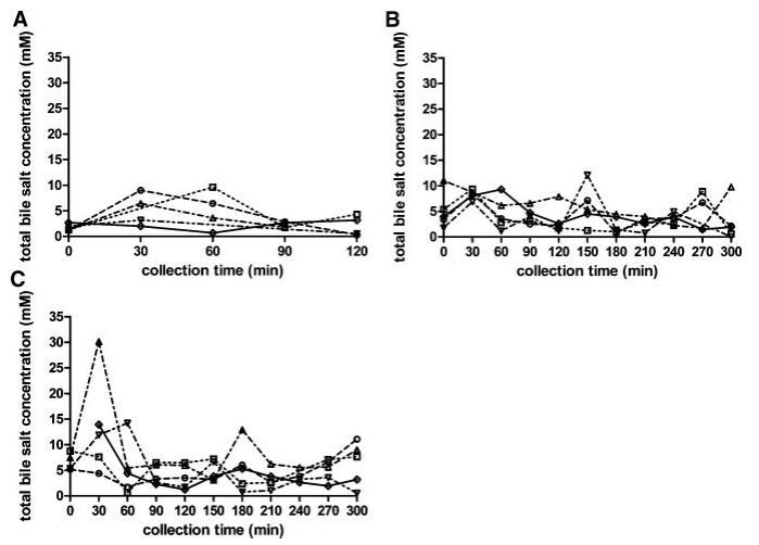 圖3。在禁食(A)、喂食(B)和高脂喂食(C)狀態(tài)HIF中,總膽汁鹽濃度(mM)隨餐后給藥時(shí)間的變化。(--?--)主題1(··?··)主題2,(·–·)△·–·)主題3,(·-·▽·–·)主題4,(-◇–)科目5。