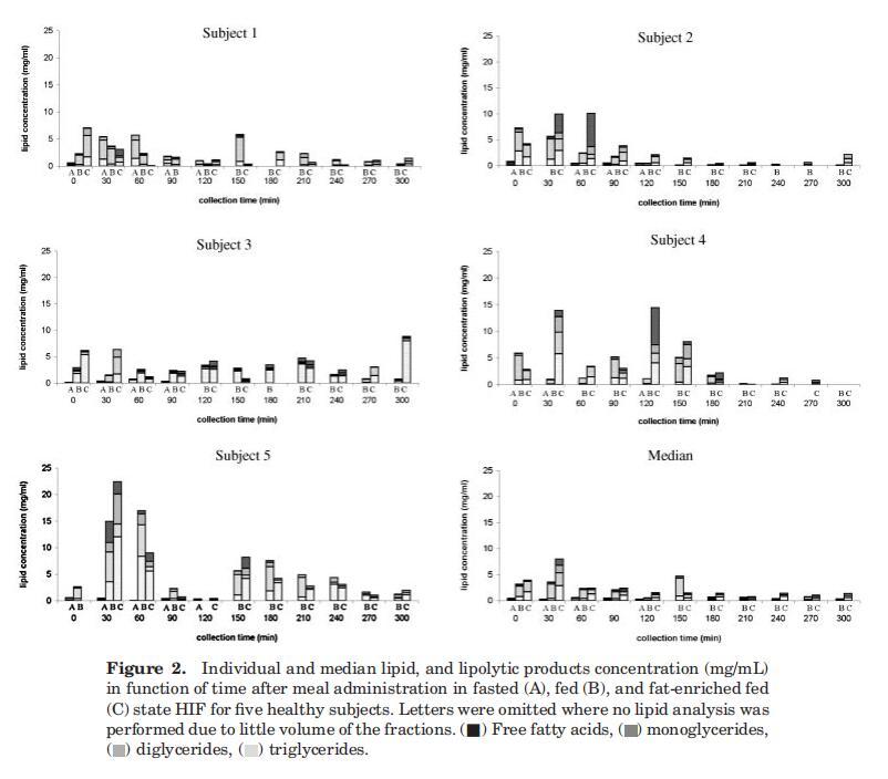 對(duì)于四名受試者(S2、S3、S4、S5),在禁食狀態(tài)HIF中發(fā)現(xiàn)微量脂質(zhì)(平均0.4?0.3 mg/mL),這與Armand等人12報(bào)告的受試者1十二指腸吸出物中的禁食水平0.6 mg/mL相符,禁食狀態(tài)下的脂質(zhì)濃度等于或高于30-120分鐘期間在喂食和富含脂肪的喂食狀態(tài)下測(cè)定的濃度(圖2)。這一觀(guān)察的可能原因可能與胃滯留時(shí)間和/或小腸上皮細(xì)胞的周轉(zhuǎn)率有關(guān),從而釋放膜脂。在喂食和富含脂肪的喂食狀態(tài)之間,根據(jù)個(gè)體特征,沒(méi)有發(fā)現(xiàn)實(shí)質(zhì)性差異。然而,中位數(shù)曲線(xiàn)顯示,進(jìn)食30分鐘后,在高脂肪喂養(yǎng)狀態(tài)下,總脂質(zhì)濃度顯著增加。由于沒(méi)有觀(guān)察到脂質(zhì)產(chǎn)物在管腔內(nèi)出現(xiàn)延遲,因此可以得出結(jié)論,服用液體膳食的脂肪含量的應(yīng)用差異不會(huì)改變胃排空。先前已經(jīng)證明,給予恒河猴的碳水化合物、蛋白質(zhì)和脂肪等熱量負(fù)荷產(chǎn)生了相似的胃排空率,這表明胃排空是根據(jù)膳食的熱量密度進(jìn)行調(diào)節(jié)的,而不管其營(yíng)養(yǎng)成分如何。32