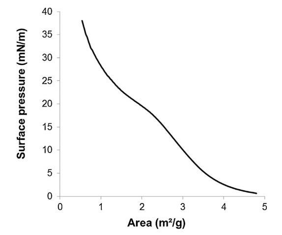 通過傳播精漿在空氣/緩沖液界面形成的單層的表面壓力面積(?–A)等溫線(n=3,標準偏差在0-18.9 mN/m范圍內不超過1.5 mN/m,在18.9-38 mN/m范圍內不超過1.2 mN/m)。