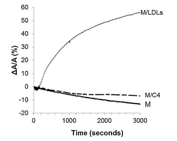將低密度脂蛋白和脂質體引入精子膜仿生外小葉亞期的影響如圖4所示。對于控制測量(未注入任何保護劑,設計為圖4中的M),表面積隨時間略微減小。當低密度脂蛋白被注射到重建的外小葉下方的亞相(圖4中的曲線M/LDL)時,它導致表面積快速而大的增加。相反,與參考單層(曲線M)相比,脂質體的注射(圖4中的曲線M/C4)幾乎沒有改變單層的膜壓力。脂質體與單層脂質體的結合動力學比低密度脂蛋白慢得多。因此,在與精液制備相對應的時間尺度上,脂質體在空氣-水界面上的吸附較弱。