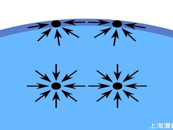 液體內部分子A與周圍分子的作用力是對稱的,相互抵消,合力為零,因此A在液體內部移動時不需要做功。而對于表面分子B,與表面下的水分子相互的作用力強烈,與表面上的空氣作用力則較弱。由于上下的作用力大小不一致,因此B處于一個不對稱的力場中,形成了一股指向內部的合力,此力力圖將其拉回液體的內部。