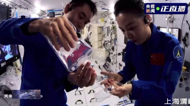 由葉光富將航天員平時(shí)所喝的飲用水慢慢傾倒在液橋板上。