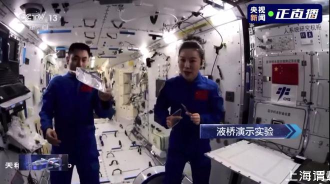 王亞平解釋,在地面重力的環(huán)境下,水的表面張力微不足道,所以同學(xué)們無法用純水做出一個(gè)液橋。而在太空中,由于重力消失,液體表面張力就可以用液體搭建出一座橋。