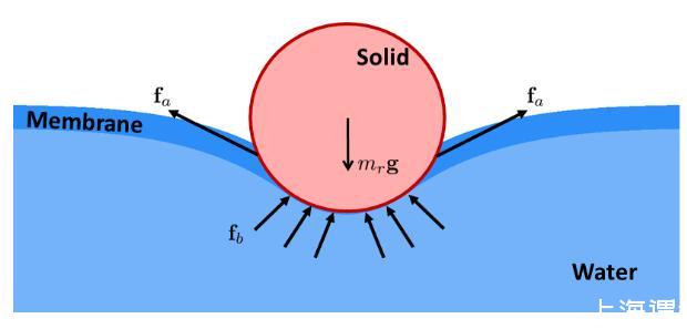 其中是流體表面的面積,稱為表面張力系數。當流體與固體發生作用時,流體表面的分子同時會受到固體分子的作用,從而將表面張力作用在固體上。固體根據表面特性不同可以分為親水和疏水兩類,疏水材質在水面上會受到向上的表面張力作用,對于一些細小的結構來說這個力要比浮力更為明顯。比如說水黽是一種可以生活在水面上的昆蟲,它的腳非常細長,并且有很多絨毛來保持疏水特性,因而水黽可以依靠表面張力維持自身的重量,并通過腳來劃動水面來向前運動甚至跳起。
