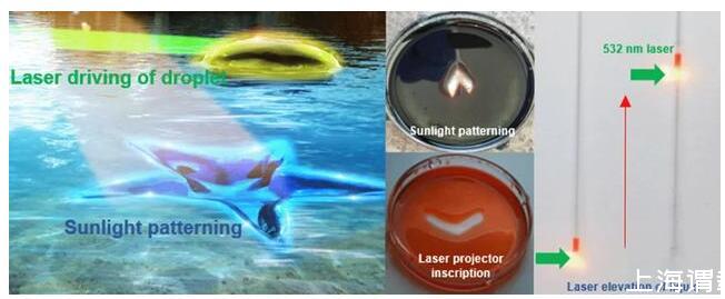 研究中,王志明團隊也展示了一些基本應用示例,比如借助激光和日光可以在液體表面雕刻圖形,還可讓激光搬運液體,讓激光驅動毛細管中的液體,讓激光驅動液體表面液滴、甚至驅動不同液滴發生化學反應的應用。