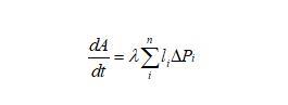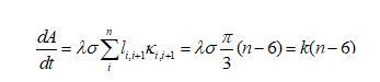 下面我們推導二維泡沫的演變方程,由于任一氣泡跟周圍氣泡的氣體交換都是通過氣泡邊界進行的,則氣泡體積(二維氣泡用面積表示)隨時間的變化率跟邊界長度和邊界上的壓強差都有關系,可以表示為