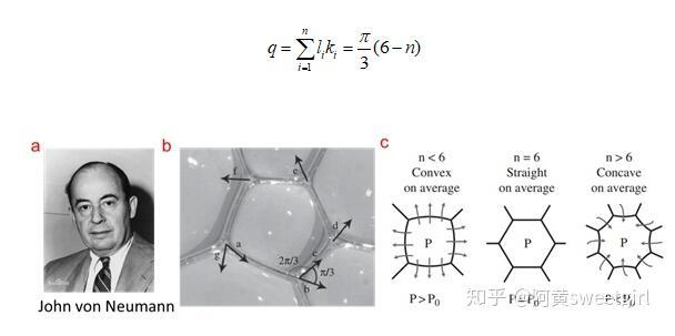 Von Neumann的二維演變方程的著名及其重要性是它不單單適用于二維泡沫,凡是具有網格結構的二維體系,界面移動受界面張力調控,其速率受界面曲率調控的情形都可以用這個方程去表達。這種情形在自然界中是十分普遍的,比如如水上面油脂分子層的演化、熔化時晶界的變化、冰晶的生長等(Ref 5,Ref 6)。