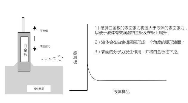 當(dāng)感測(cè)到鉑金板浸入到被測(cè)液體后,鉑金板周圍就會(huì)受到表面張力的作用,液體的表面張力會(huì)將鉑金盡量的往下拉。當(dāng)液體表面張力及其他相關(guān)的力與平衡力達(dá)到均衡時(shí),感測(cè)鉑金板就會(huì)停止向液體內(nèi)部浸入。這時(shí)候,儀器的平衡感應(yīng)器就會(huì)測(cè)量浸入深度,并將它轉(zhuǎn)化為液體的表面張力值。