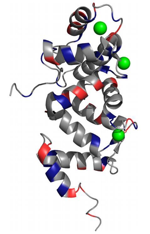 圖4.nmNCS1結(jié)構上的正(紅色)和負(藍色)電荷(PDB 2LCP)[23](關于此圖例中顏色的說明,讀者請參閱本文的web版本)。