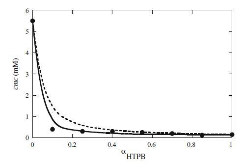 圖2 HTPB+Mega-10混合體系混合臨界膠束濃度(cmc)與αHTPB的關系圖。填充的圓圈表示實驗cmc。虛線表示HTPB+Mega-10混合體系理想行為的相分離模型,而實線最符合RST和βmic 12的數據=?3.91