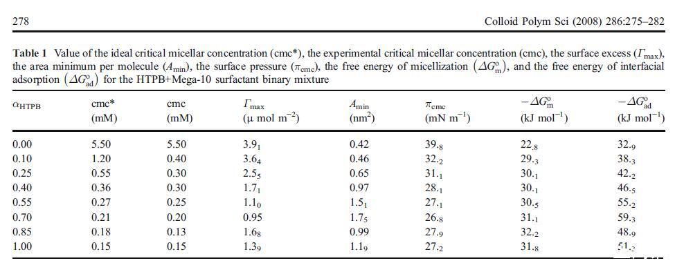 其中N是阿伏伽德羅數。表1中列出了HTPB和Mega-10混合系統的最大值和最小值。純Mega-十的最大值與報告值一致[3]。Mega-10的Γmax值高于HTPB。這種行為表明兩親性Mega-10比HTPB排列得更緊湊。這是由于存在導致靜電排斥的電荷,以及HTPB分子中存在體積龐大的三苯基,導致空間位阻,防止HTPB分子在界面處緊密堆積。二元混合物的Γmax隨著HTPB摩爾分數的增加而減小。這種效應可以認為是由于HTPB離子頭基團的靜電排斥或空氣-水界面存在熱運動導致單層不穩定。另一方面,Amin值明顯顯示相反的行為,如等式3。